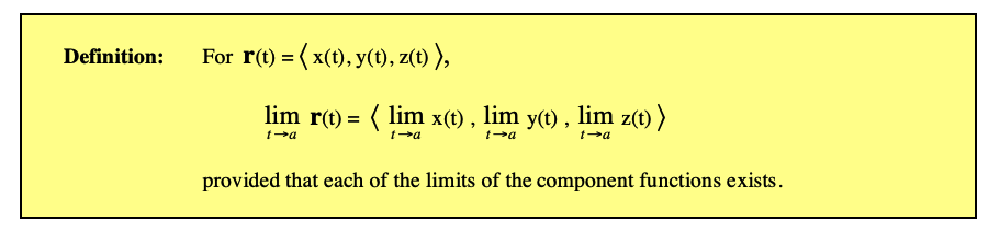 A vector valued function \(r(t)\) is continuous at \(t_0\) if \(\lim\limits_{t \to t_0} r(t) = r(t_0)\)